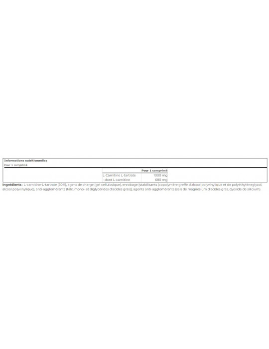 Ingredienti: [stabilisants (copolymère greffé d'alcool polyvinylique et de polyéthylèneglycol, alcool polyvinylique), anti-agglomérants (talc, mono- et diglycérides d'acides gras)] L-carnitina L-tartrato (50%), agente di carica (gel di cellulosa), rivestimento, agenti antiagglomeranti (sali di magnesio degli acidi grassi, biossido di silicio).
