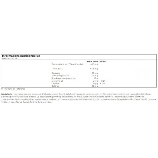 RA: Assunzione di RiferimentoIngredienti: acqua, succo concentrato di mela (Malus domestica Borkh), stabilizzante: glicerina, estratto di tè verde (Thea sinensis L.), aroma di frutti rossi, alcol etilico, estratto di pilosella (Hieracium pilosella L.), addensante: gomma di guar, guaranà (Paullinia cupana Kunth), caffeina, acidificante: acido citrico, aroma di lampone, aroma di lampone.), addensante: gomma di guar, guaranà (Paullinia cupana Kunth), caffeina, acidificante: acido citrico, aroma di lampone, conservanti: benzoato di sodio, conservanti: sorbato di potassio, cloruro di cromo, edulcorante: sucralosio - acesulfame di potassio, vitamina B6. L'aroma fruttato è aggiunto mediante aromatizzazione del prodotto.