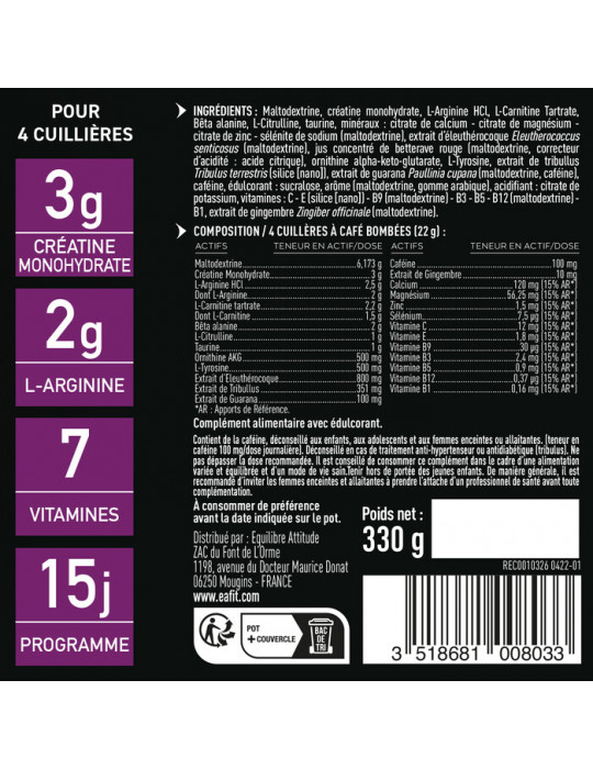 Altri ingredienti: maltodestrina, creatina monoidrato, L-Arginina HCl, L-Carnitina tartrato, Beta alanina, L-Citrullina, taurina, minerali: calcio citrato - magnesio citrato - zinco citrato - selenito di sodio, estratto di Eleuterococco senticosus, succo concentrato di barbabietola rossa (regolatore di acidità : [nano] acido citrico), ornitina alfa-cheto-glutarato, L-tirosina, estratto di tribulus Tribulus terrestris, estratto di guaranà Paullinia cupana (caffeina), caffeina, edulcorante: sucralosio, aroma (gomma arabica), acidificante: citrato di potassio, vitamine: C - E (silice) - B9 - B3 - B5 - B12 - B1, estratto di zenzero Zingiber officinale.