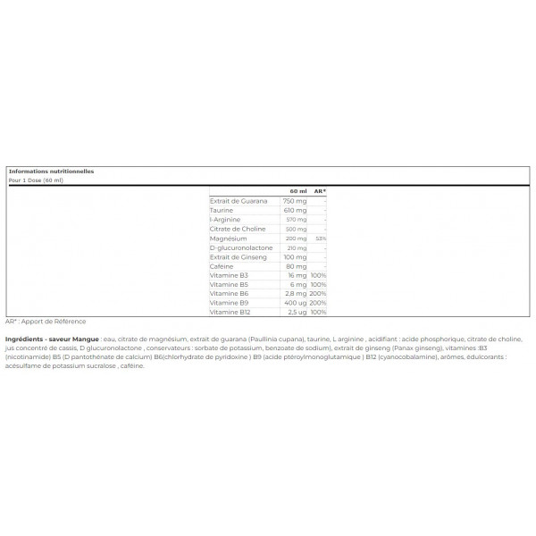 Ingredienti - Aroma di mango: acqua, citrato di magnesio, estratto di guaranà (Paullinia cupana), taurina, L-arginina, acidificante: acido fosforico, citrato di colina, succo concentrato di ribes nero, D-glucuronolattone, conservanti: sorbato di potassio, benzoato di sodio), estratto di ginseng (Panax ginseng), vitamine: B3 (nicotinamide) B5 (pantotenato di calcio D) B6 (cloridrato di piridossina) B9 (acido pteroilmonoglutammico) B12 (cianocobalamina), aromi, edulcoranti: acesulfame potassio sucralosio, caffeina.