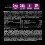 Ingredienti: antiagglomeranti: cellulosa microcristallina - fosfato dicalcico - fosfato tricalcico - magnesio stearato, L-Arginina HCL, frutto-oligosaccaridi, estratto di tè verde (Camellia sinensis), idrossimetilbutirrato di calcio (HMB), estratto di cacao (Theobroma cacao), ravanello nero (Raphanus sativus), L-Tirosina, minerali : zinco gluconato - cromo picolinato, caffeina, estratto di peperoncino (Capsicum annuum, supporto: cellulosa microcristallina), estratto di pepe nero (Piper nigrum), vitamina B6. Ingredienti di rivestimento: idrossipropilmetilcellulosa, cellulosa microcristallina, acido stearico.