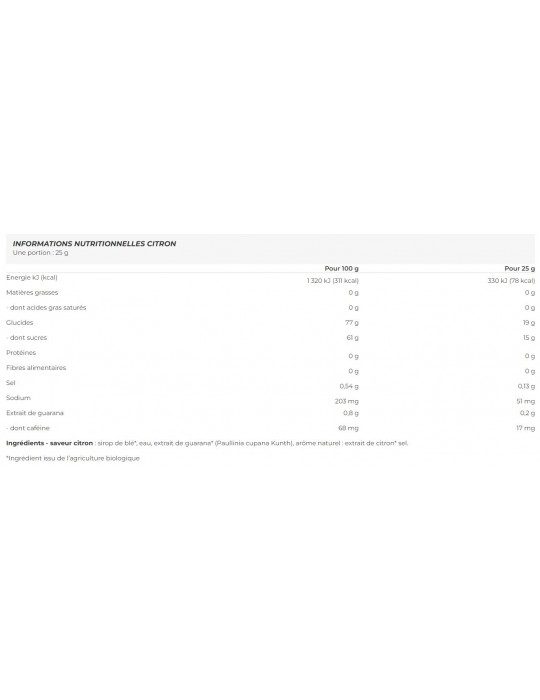 Ingredienti - aroma di limone : sciroppo di grano*, acqua, estratto di guaranà* (Paullinia cupana Kunth), aroma naturale: estratto di limone* sale.