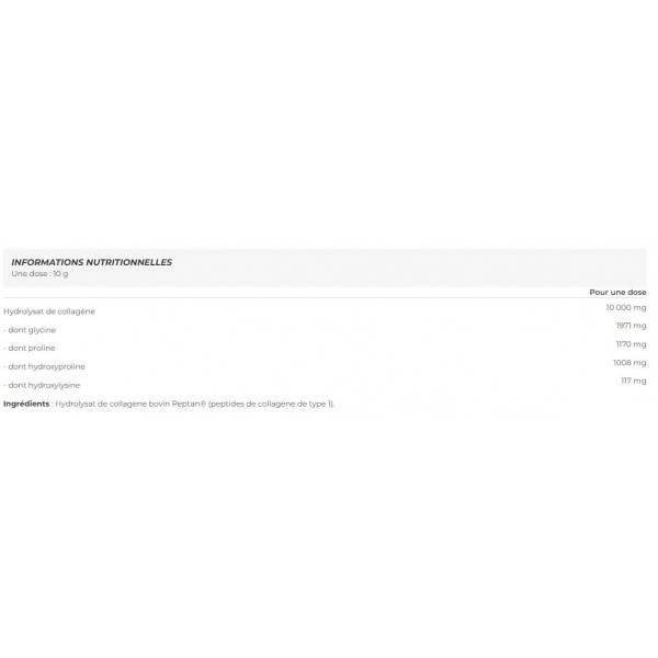 Idrolizzato di collagene - di cui glicina - di cui prolina - di cui idrossiprolina - di cui idrossilisina | 10.000 mg 1971 mg 1170 mg 1008 mg 117 mg |