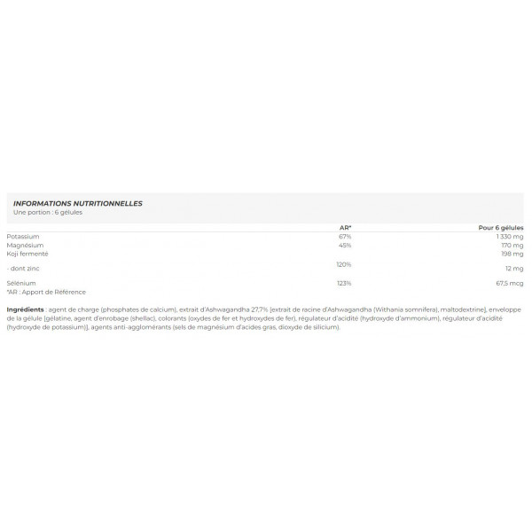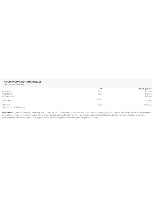 RA: Assunzione di RiferimentoIngredienti: citrato tripotassico, citrato di magnesio, zinco Ultimate 5,5%, selenio L-Selenometionina, capsula vegetale (agente di rivestimento: pullulan).