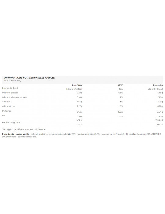 Ingredienti - Gusto vaniglia: proteine del latte isolate da siero nativo non isolato (WPI) (94%), aromi, inulina Frutafit® HD, bacillus coagulans (GANEDEN BC 30), edulcorante: sucralosio splenda®.