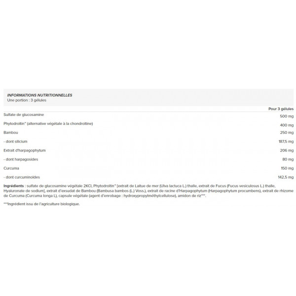 [extrait de Laitue de mer (Ulva lactuca L.) thalle, extrait de Fucus (Fucus vesiculosus L.) thalle, Hyaluronate de sodium]Ingredienti: glucosamina solfato vegetale 2KCl, Phytodroïtin™ , estratto di essudato di bambù (Bambusa bambos (L.) Voss.), estratto di radice di arpagofito (Harpagophytum procumbens), estratto di rizoma di curcuma (Curcuma longa L), capsula vegetale (agente di rivestimento: idrossipropilmetilcellulosa), amido di riso***.