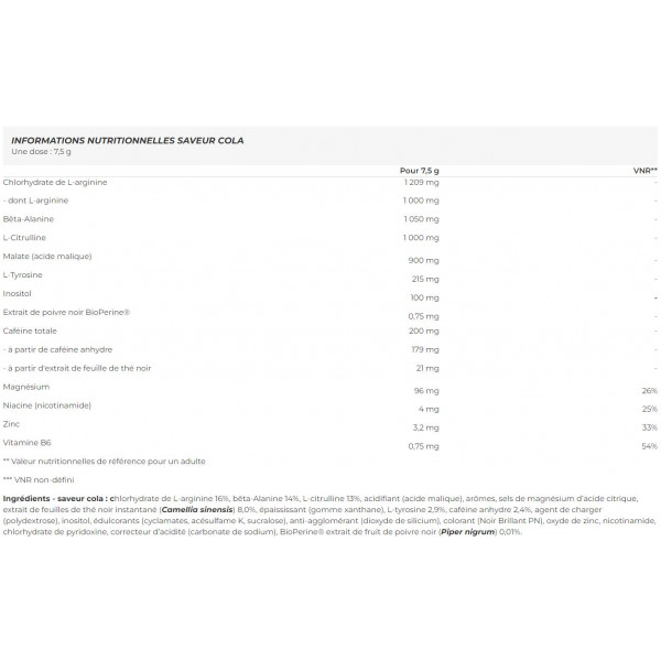 Ingredienti - gusto cola :l-argininacloridrato16%, beta-alanina 14%, L-citrullina 13%, acidificante (acido malico), aromi, sali di magnesio dell'acido citrico, estratto istantaneo di foglie di tè nero(Camellia sinensis) 8,0%, addensante (gomma di xanthan), L-tirosina 2,9%, caffeina anidra 2,4%, agente di carica (polidestrosio), inositolo, edulcoranti (ciclamati, acesulfame K, sucralosio), antiagglomerante (biossido di silicio), colorante (Noir Brillant PN), ossido di zinco, nicotinamide, piridossina cloridrato, regolatore di acidità (carbonato di sodio), estratto di frutto di pepe nero BioPerine®(Piper nigrum) 0,01%.