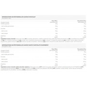 Ingredienti al gusto di cioccolato: burro di cacao, latte in polvere, edulcorante : maltitolo, pasta di cacao, proteine isolate del siero di latte[latte], croccantini di proteine di soia (7,4%) (proteine isolate di soia, amido, sale), croccantini di proteine di soia al cacao (7%) (proteine isolate di soia, amido, cacao magro in polvere), polidestrosio, grasso di burro[latte], latte scremato in polvere, emulsionante : lecitine[soia]; aroma naturale di vaniglia, edulcorante: sucralosio. cacao: minimo 40%.