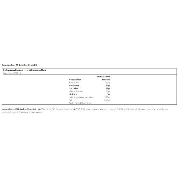 Ingredienti Frullato al cioccolato: LATTE scremato, concentrato di proteine del LATTE (29%), latte scremato in polvere, acqua, cacao magro in polvere (1,5%), stabilizzanti (cellulosa, gomma di cellulosa, carragenina), edulcorante (sucralosio).