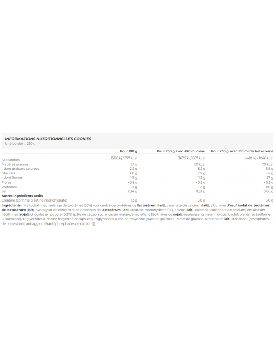 Ingredienti maltodestrina, miscela di proteine (36%) (concentrato di proteine di siero di latte (latte), caseinato di calcio (latte), albumina uovo, , proteine isolate del siero di latte (latte), idrolizzato di siero di latte (latte), creatina monoidrato (1%), aroma (latte), colorante (carbonato di calcio), emulsionante (lecitine [soiaCioccolato in polvere (0,2%) (pasta di cacao, zucchero, cacao magro, emulsionante [lecitina di cacao]) soia]), addensanti (gomma di guar), edulcoranti (acesulfame-K, sucralosio), trigliceridi a catena media incapsulati (trigliceridi a catena media [huile de palmiste], sciroppo di glucosio latte, stabilizzatore [phosphates de potassium], agente antiagglomerante [phosphates de calcium]).