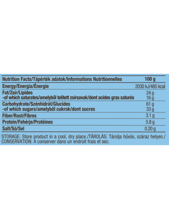 Disponibile nei seguenti gusti: cocco, mirtillo, pera - yogurt al lampone, banana - cioccolato, noci e noci pecan.