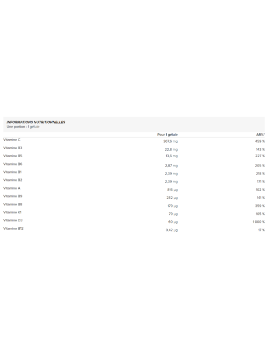 Ingredienti: acido L-ascorbico (Vitamina C), capsula trasparente(gelatina di manzo), niacinamide (Vitamina B3), calcio D-pantotenato (Vitamina B5), piridossina cloridrato (Vitamina B6), tiamina mononitrato (Vitamina B1), riboflavina 5'-fosfato sodico (Vitamina B2), acetato di retinile (Vitamina A), Metafolin® L-metilfolato di calcio (Vitamina B9), D-biotina (Vitamina B8), fillochinone (Vitamina K1), colecalciferolo (Vitamina D3), cianocobalamina (Vitamina B12).