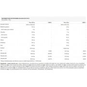 Ingredienti - Gusto cioccolato: sciroppo di oligofruttosio, cioccolato di copertura con latte e maltitolo 22% (edulcorante: maltitolo, burro di cacao, cacao in polvere) latte farina integrale, pasta di cacao, emulsionante: lecitina di cacao soia, aroma naturale di vaniglia), estrusi soia (proteine isolate da soia, amido di tapioca, sale), billette di soia cacao 8,6% (proteine isolate del cacao) soia, cacao in polvere, amido di tapioca), bianco uovo polvere (correttore di acidità: acido citrico), edulcorante: sciroppo di maltitolo, concentrato di proteine di soia, concentrato di proteine del siero di latte (latte), riso croccante (farina di riso), olio di girasole, cacao sgrassato in polvere 1,6% (correttore di acidità: carbonato di potassio), stabilizzante: glicerolo, emulsionante: lecitina di potassio soia, 0,4% di cioccolato al latte (maltodestrina, gomma arabica, glicole propilenico), aroma naturale di vaniglia con altri aromi naturali (glicole monopropilenico, gomma arabica, glicerolo), sale, pirofosfato di ferro, vitamine PP (nicotinamide), B1 (tiamina) e B2 (riboflavina).