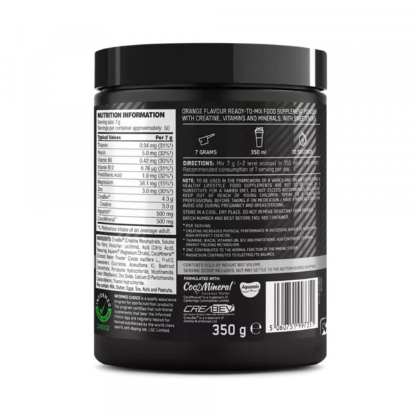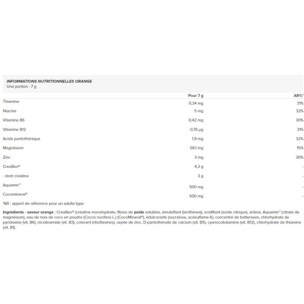 Ingredienti - gusto arancia: CreaBev® (creatina monoidrato, fibra solubile , emulsionante (lecitine)), acidificante (acido citrico), aroma, Aquamin™ (magnesio citrato), acqua di cocco in polvere (Cocos nucifera L.) (CocoMineral®), edulcoranti (sucralosio, acesulfame-K), concentrato di barbabietola, piridossina idrolizzata.) (CocoMineral®), edulcoranti (sucralosio, acesulfame-K), concentrato di barbabietola, piridossina cloridrato (vit. B6), nicotinamide (vit. B3), colorante (riboflavine), ossido di zinco, calcio D-pantotenato (vit. B5), cianocobalamina (vit. B12), tiamina cloridrato (vit. B1).