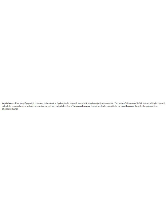 Ingredienti: Acqua, peg-7 glicerilcocoato, peg-40 olio di ricino idrogenato, laureth-9, c10-30 alkyl acrylates/cross-polymers, aminomethylpropanol, estratto di nocciolo di avena sativa, carbomer, glicerina, estratto di cono dihumulus lupulus, limonene, olio essenziale di mentha piperita, etilesilglicerina, fenossietanolo.
