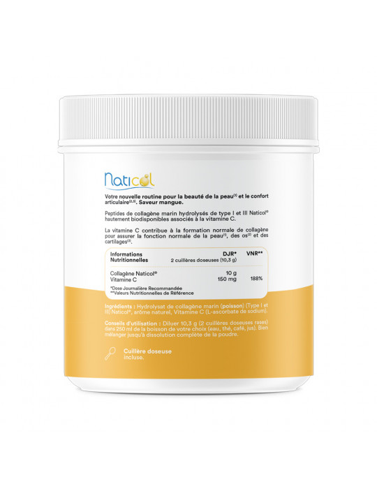 Ingredienti: Idrolizzato di collagene marino (pesce) (tipo I e III) Naticol®, aroma naturale, vitamina C (L-ascorbato di sodio).