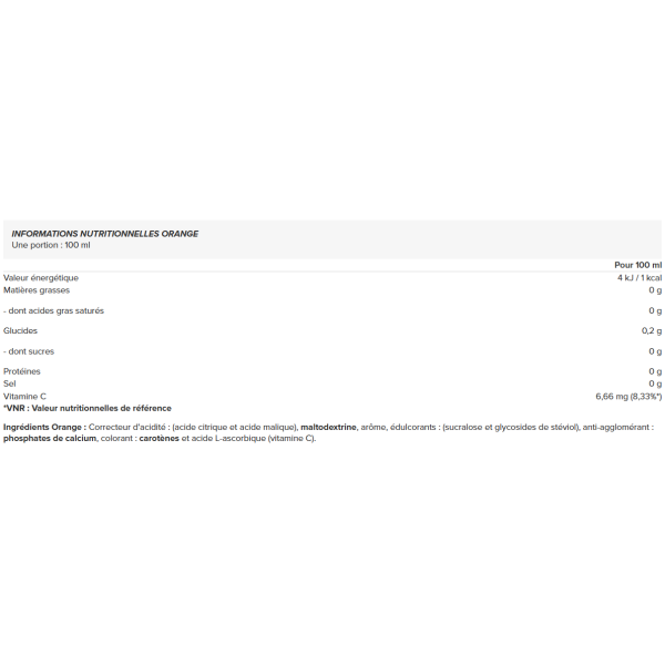 Ingredienti arancia: regolatore di acidità: (acido citrico e acido malico), maltodestrina, aroma, edulcoranti: (sucralosio e glicosidi steviolici), antiagglomerante: fosfati di calcio, coloranti: caroteni e acido L-ascorbico (vitamina C).