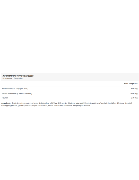 Ingredienti: acido linoleico coniugato [80% CLA estere etilenico; vettore [ olio di soia(soia)] addensante (cera d'api), emulsionante (lecitina di soia)], involucro (gelatina, glicerolo, sorbitolo, ossido di ferro marrone), estratto di tè verde, acetato di DI-alfa tocoferile.