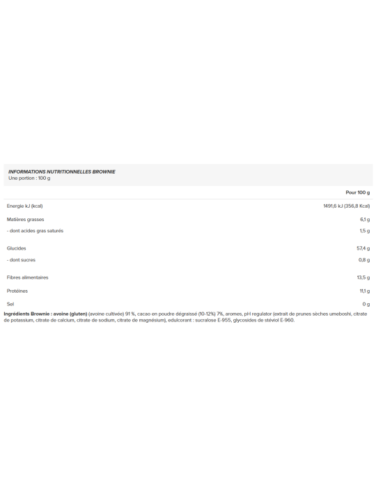 Ingredienti - Gusto Brownie : avena (glutine) (avena coltivata) 91%, cacao sgrassato in polvere (10-12%) 7%, aromi, regolatore di pH (estratto di prugna secca umeboshi, citrato di potassio, citrato di calcio, citrato di sodio, citrato di magnesio), edulcorante: sucralosio E-955, glicosidi steviolici E-960.