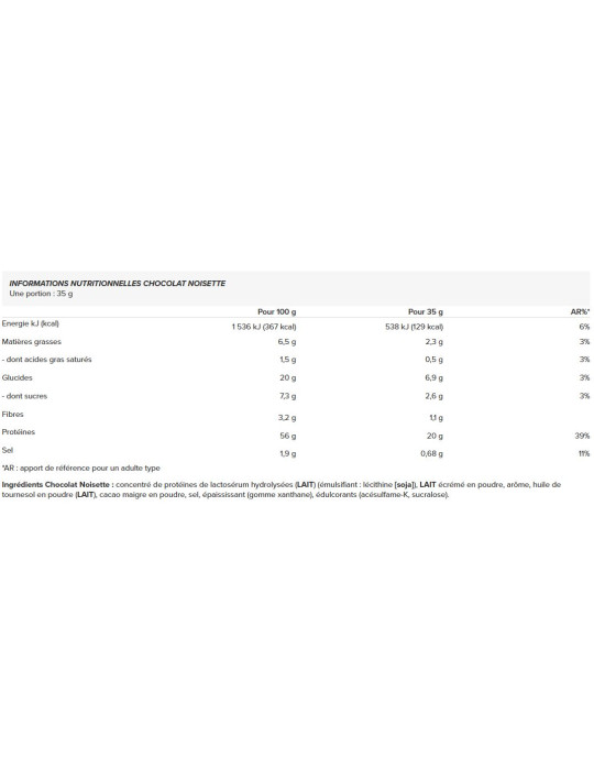 Ingredienti Cioccolato alla nocciola: concentrato idrolizzato di proteine del siero di latte(LATTE) (emulsionante: lecitina) [soja]), latte scremato in polvere, aroma, olio di girasole in polvere(LATTE), cacao magro in polvere, sale, addensante (gomma di xantano), edulcoranti (acesulfame-K, sucralosio).