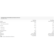 Ingredienti Doppio cioccolato: 39% di miscela proteica [concentrato di proteine del latte MPC, idrolizzato di collagene, isolato di proteine della soia, concentrato di proteine del siero di latte WPC(latte), glutine di grano idrolizzato], 19% di cioccolato con edulcorante [pasta di cacao, edulcorante: maltitoli; burro di cacao, emulsionante: lecitine (soia); aroma naturale di vaniglia], umettanti: sorbitoli, glicerolo; polidestrosio, 4,5% cacao magro (burro di cacao 10-12%), olio vegetale (girasole), maltodestrina, emulsionante: lecitine (soia); sale, aroma, edulcorante: sucralosio; bisglicinato di zinco (da Albion™ aminoacido chelato), colecalciferolo - vit. D, ossido di magnesio. Cioccolato - cacao: 53% minimo.