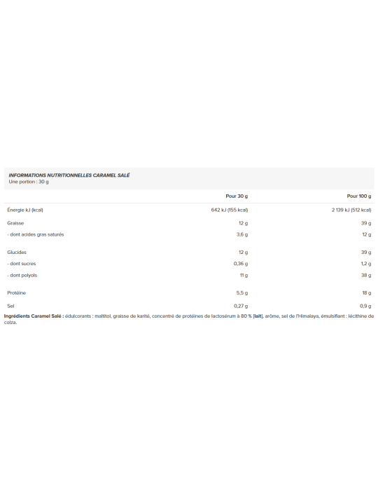Ingredienti del caramello salato : edulcoranti: maltitolo, burro di karité, 80% di proteine del siero di latte concentrate[latte], aroma, sale daHimalaya, emulsionante: lecitina di colza.
