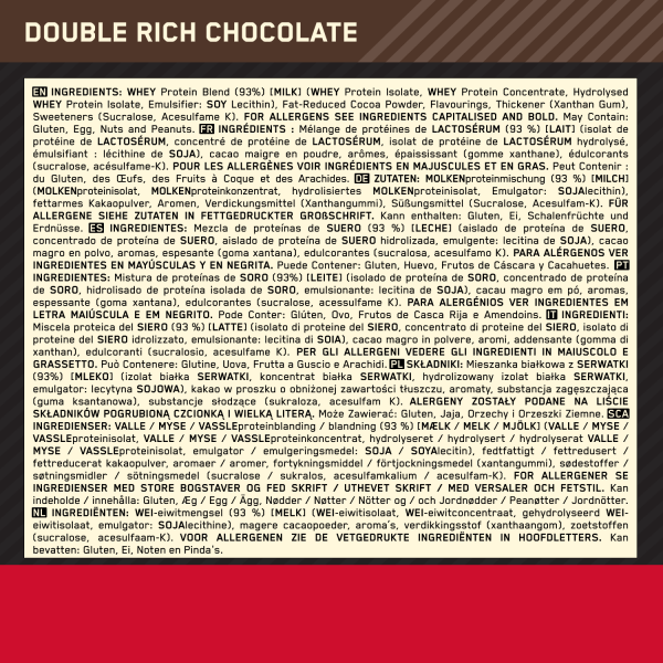 Ingredienti del cioccolato : miscela di proteine ( proteine del siero del latte isolate (emulsionante (lecitina di soia)), concentrato di proteine del siero del latte, proteine del siero del latte isolate idrolizzate), cacao magro in polvere, aromi, edulcoranti (acesulfame-K, sucralosio), complesso enzimatico (amilasi, proteasi, cellulasi, beta-d-galattosidasi, lipasi).