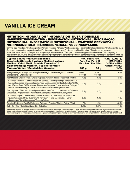 Ingredienti Vaniglia : miscela di proteine ( proteine del siero del latte isolate (emulsionante (lecitina di soia)), concentrato di proteine del siero del latte, proteine del siero del latte isolate idrolizzate), aromi, colorante (curcumina), addensante (gomma xantana), edulcoranti (acesulfame-K, sucralosio).