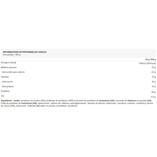Ingredienti - vaniglia: proteine in polvere (34%), [miscela proteica al 96% ( proteine del siero di latte concentrate[latte], latticello in polvere concentrato[latte], proteine del siero di latte isolate[latte]), addensante: gomma di cellulosa, antiagglomerante: biossido di silicio, edulcorante: sucralosio, colorante: caroteni], burro di cacao (29%), edulcorante: eritritolo, latte intero in polvere, emulsionante: lecetine.
