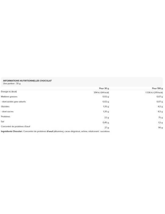 Senza aspartame né zuccheri aggiunti, questa proteina offre un'opzione salutare con sole 94 kcal per porzione (a seconda del gusto) e meno di 2 g di zucchero. L'origine 100% uovo la rende una soluzione perfetta per le persone intolleranti al lattosio. È un'alternativa ideale alle proteine tradizionali derivate dal latte, così come alle proteine vegetali che spesso hanno una consistenza particolare.