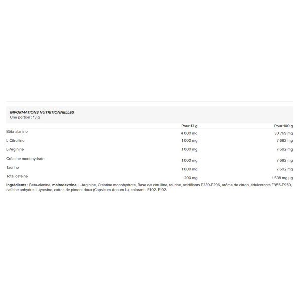 Ingredienti: Beta-alanina, maltodestrina, L-arginina, creatina monoidrato, base di citrullina, taurina, acidificanti E330-E296, aroma di limone, edulcoranti E955-E950, caffeina anidra, L-tirosina, estratto di peperone dolce (Capsicum Annum L.), colorante: E102. E102.