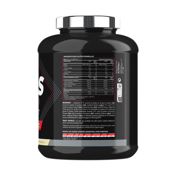 Ingredienti cremosi al gusto di vaniglia 52% di maltodestrina, concentrato istantaneo di proteine del siero di latte (latte) {concentrato di proteine del grano (latte), emulsionante [lecitine (soia)]} 14%, inulina 9,2%, caseinato di calcio istantaneo (latte) [caseinato di calcio (latte), emulsionante (mono- e digliceridi degli acidi grassi)] 5,8%, amido di mais ceroso 5,1%, L-arginina cloridrato 2,8%, addensante (gomma di cellulosa), creatina monoidrato micronizzata 2,6%, proteine isolate del siero di latte istantanee (latte) {proteine isolate di frumento (latte), emulsionante [lecitine (soia)]} 2,5%, aromi, emulsionante [lecitine (soia)], sale, edulcorante (sucralosio), bisglicinato di zinco, bromelina di ananas (1200 GDU/g) 0,03%, papaina di papaia (1,5 FIP U/mg) 0,03%