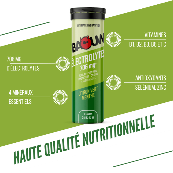 Elettroliti (10 compresse) di Baouw sono compresse per l'idratazione studiate per soddisfare le esigenze degli sportivi che vogliono coniugare prestazioni, salute e naturalità. Ogni compressa fornisce 706 mg di elettroliti, il 60% in più rispetto alla media del mercato, per compensare efficacemente le perdite di minerali attraverso la sudorazione.