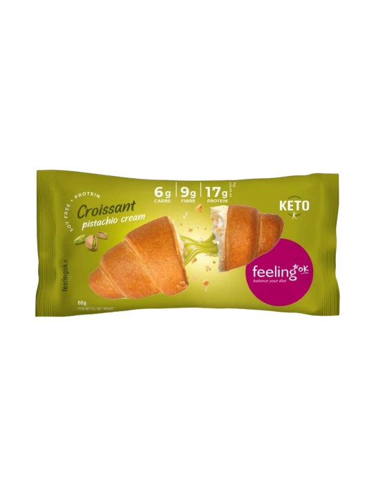 Il croissant alla crema di pistacchio (65 g) del marchio italiano FEELINGOK è un'opzione gustosa per chi cerca uno spuntino equilibrato che unisca piacere e nutrizione.