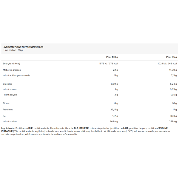 Ingredienti : Proteine del GRANO, proteine del riso, fibra di acacia, fibra di GRANO, BURRO, crema di pistacchio (proteine del LATTE, proteine del pisello, proteine dell'AVENA, PISTACCHI (5%), proteine del riso, eritritolo, olio di girasole alto oleico), emulsionante: lecitina di girasole, E471, sale, lievito naturale, conservanti: sorbato di potassio, edulcoranti: ciclamato di sodio, aroma di vaniglia.