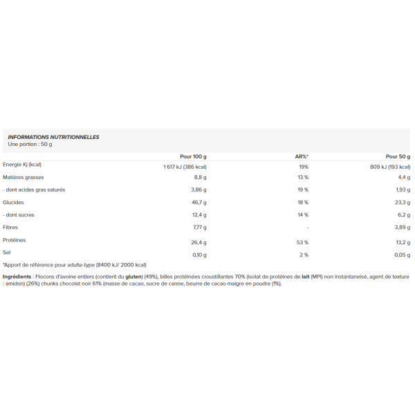 Ingredienti: Avena integrale (contiene glutine) (49%), palline proteiche croccanti 70% (proteine isolate del latte non istantanee (MPI), agente testurizzante: amido) (26%) pezzi di cioccolato fondente 61% (pasta di cacao, zucchero di canna, burro di cacao magro in polvere (1%).
