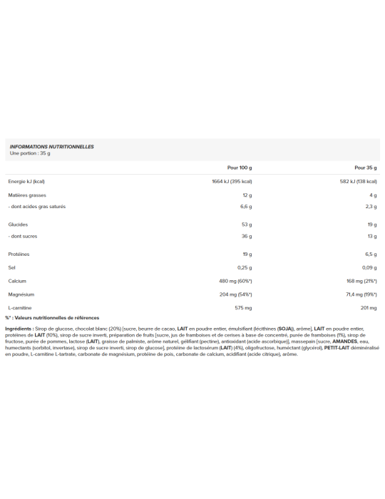Ingredienti : Sciroppo di glucosio, cioccolato bianco (20%) [zucchero, burro di cacao, latte intero in polvere, emulsionante (lecitine(SOYA)), aroma], latte intero in polvere, proteine del latte (10%), sciroppo di zucchero invertito, preparazione di frutta [zucchero, succo di lampone e ciliegia da concentrato, purea di lampone (1%), sciroppo di fruttosio, purea di mela, lattosio(LATTE), grasso di palmisti, aroma naturale, gelificante (pectina), antiossidante (acido ascorbico)], marzapane [zucchero, mandorle, acqua, umettanti (sorbitolo, invertasi), sciroppo di zucchero invertito, sciroppo di glucosio], proteine del siero di latte(LATTE) (4%), oligofruttosio, umettante (glicerolo), LATTE demineralizzato in polvere, L-carnitina L-tartrato, carbonato di magnesio, proteine di pisello, carbonato di calcio, acidificante (acido citrico), aroma.