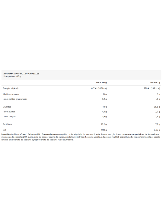 Ingredienti: albume d'uovo, farina di frumento, avena integrale, olio vegetale di girasole, soia, umettante glicerina, concentrato di proteine del siero di latte, pezzi di cioccolato 20% zucchero, pasta di cacao, burro di cacao, emulsionante lecitina (1), aroma di vaniglia, edulcorante maltitolo, acesulfame K, scorza d'arancia grattugiata, agenti lievitanti bicarbonato di sodio, pirofosfato di sodio. (1) di girasoli.