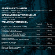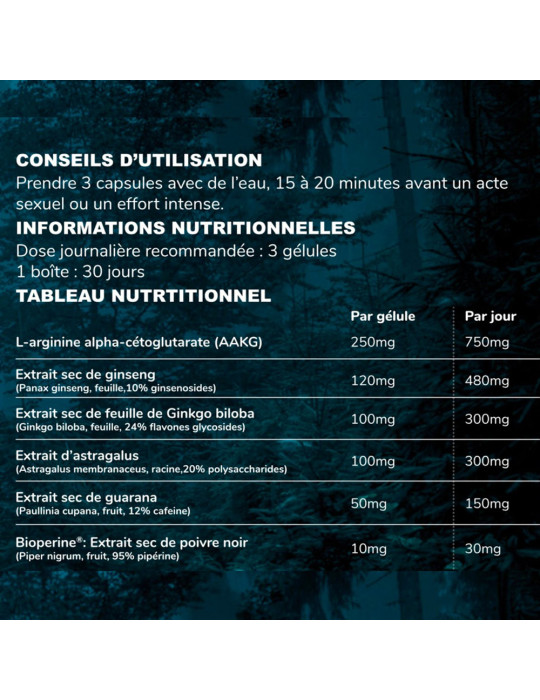 Ingredienti : L-arginina alfa-chetoglutarato (AAKG), capsula [agent d'enrobage: hydroxypropylméthylcellulose], estratto secco di ginseng (Panax ginseng, foglia, 10% ginsenosidi), estratto secco di Ginkgo biloba (Ginkgo biloba, foglia, 24% flavoni glicosidi), estratto di astragalo (Astragalus membranaceus, radice, 20% polisaccaridi), farina di riso, estratto secco di guaranà (Paullinia cupana, frutto, 12% caffeina), Bioperine®: estratto secco di pepe nero (Piper nigrum, frutto, 95% piperina).