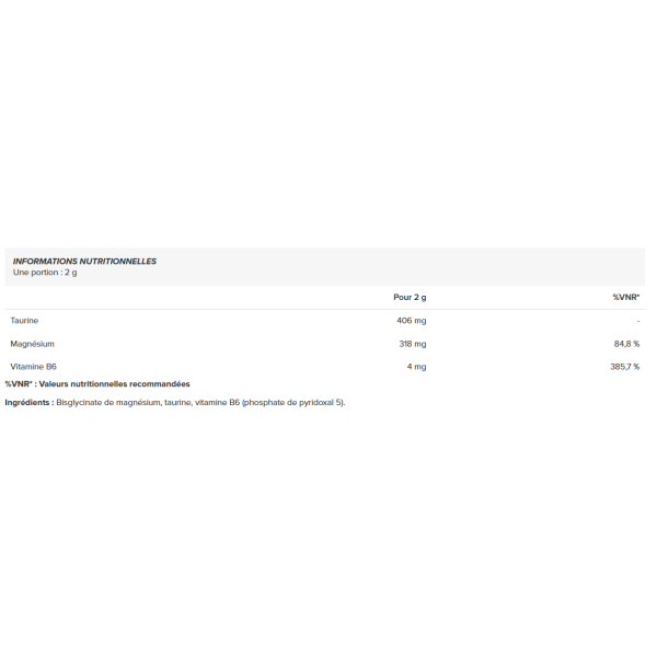 Ingredienti: magnesio bisglicinato, taurina, vitamina B6 (piridossal 5 fosfato).