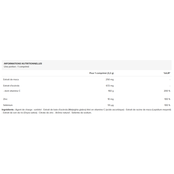 Ingredienti : Agente di carica: sorbitolo - Estratto di bacche di Acerola (Malpighia glabra) titolato in vitamina C (acido ascorbico) - Estratto di radice di Maca (Lepidium meyenii) - Estratto di crusca di riso (Oryza sativa) - Zinco citrato - Aroma naturale - Selenito di sodio.