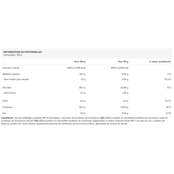 Ingredienti : 100%avena integrale biologica, proteine del siero del latte concentrate(latte) (30%) (contiene emulsionante lecitina di girasole), proteine del siero del latte isolate ISO-XP(latte) (10%) (contiene emulsionante lecitina di girasole), trigliceridi a catena media (olio di cocco MCT, amido di tapioca), cacao in polvere, aroma, addensante (gomma xantana), edulcorante (sucralosio, glicosidi steviolici).