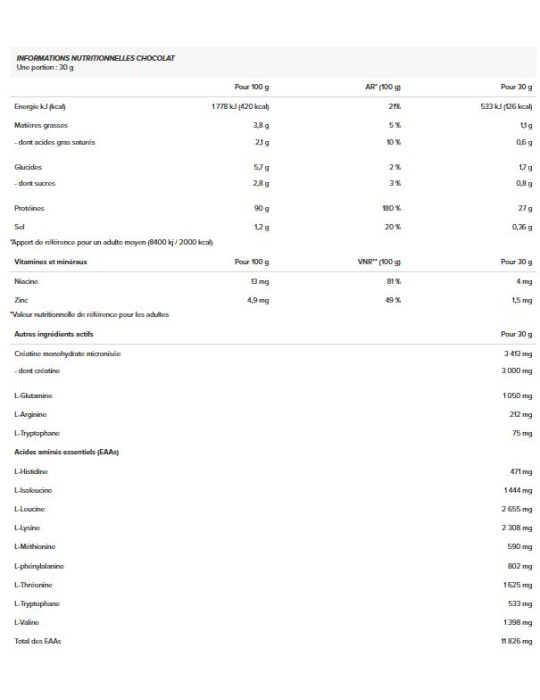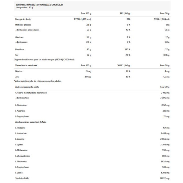 Ingredienti del cioccolato :Proteine isolate dasiero di latteIstantaneo 72% [proteine isolate del lattesiero di latte, emulsionante: lecitine (soia)], creatina monoidrato micronizzata 11,4%, cacao magro in polvere, L-glutammina, aromi, agente scremante [grasso di cocco parzialmente idrogenato,lattePolvere, emulsionanti (E471, E472a), sciroppo di glucosio, saccarosio, proteine dilatte, stabilizzante (fosfati di potassio)], emulsionante: lecitine (soia), addensanti (carragenina, gomma xantana), L-arginina, sale, antiagglomerante (biossido di silicio), L-triptofano, edulcorante (sucralosio), bisglicinato di zinco, niacina (nicotinamide, acido nicotinico).