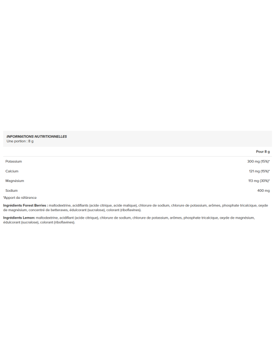 Ingredienti Frutti di bosco: maltodestrina, acidificanti (acido citrico, acido malico), cloruro di sodio, cloruro di potassio, aromi, fosfato tricalcico, ossido di magnesio, concentrato di barbabietola, edulcorante (sucralosio), colorante (riboflavine).