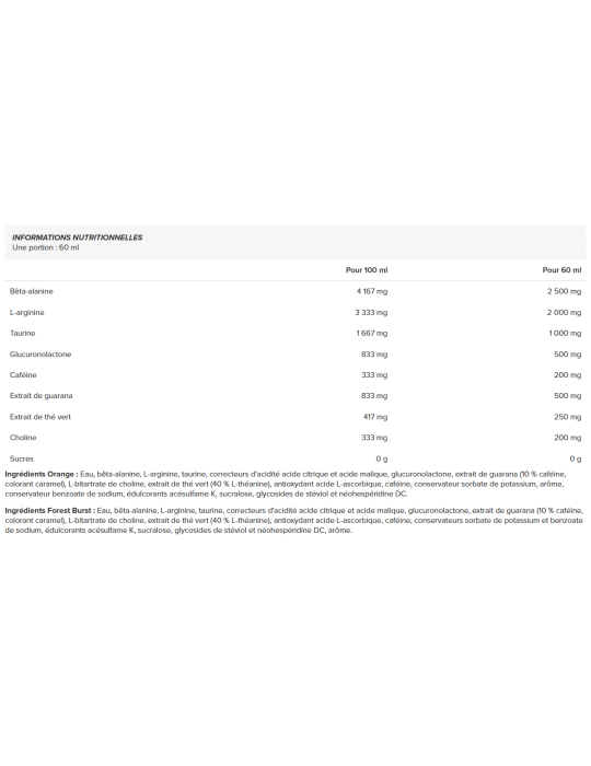 Ingredienti Arancia : acqua, beta-alanina, L-arginina, taurina, regolatori di acidità acido citrico e acido malico, glucuronolattone, estratto di guaranà (10% caffeina, colore caramello), L-colina tartrato, estratto di tè verde (40% L-teanina), antiossidante acido L-ascorbico, caffeina, conservante sorbato di potassio, aroma, conservante benzoato di sodio, edulcoranti acesulfame K, sucralosio, glicosidi steviolici e neoesperidina DC.
