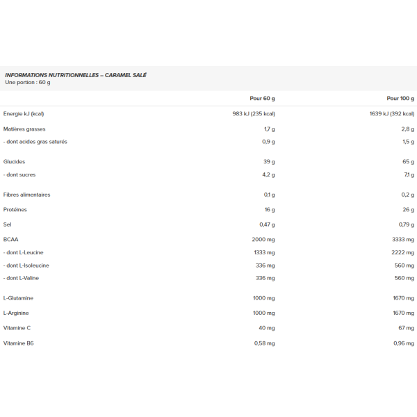 Ingredienti (Caramello salato): maltodestrina, concentrato di proteine del siero di latte(latte) (emulsionante: lecitina di soia), aminoacidi a catena ramificata istantanei in polvere (BCAA) 2:1:1, idrolizzato di proteine del siero di latte(latte), isolato di proteine del siero di latte(latte), lecitina di soia, aroma, L-glutammina, L-arginina base, L-leucina, lecitina di girasole in polvere, beta-ciclodestrina, sale, addensante (gomma di xanthan), caramello in polvere, edulcoranti (sucralosio, glicosidi steviolici), vitamina C (acido ascorbico), vitamina B6 (piridossina cloridrato).