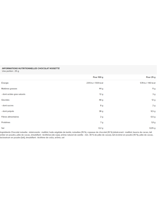 Ingredienti: edulcoranti: maltitolo, olio vegetale di burro di karité, nocciole (19%), gocce di cioccolato (10%) (edulcorante: maltitolo, burro di cacao, latte intero in polvere, pasta di cacao, emulsionante: lecitina [soia], aroma naturale di vaniglia - min. 30% di massa di cacao), latte scremato in polvere (10%), massa di cacao, siero di latte in polvere[latte], emulsionante: lecitina di colza, aromi, sale.