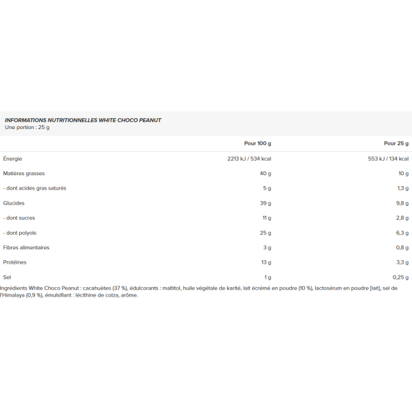 Ingredienti: arachidi Arachidi (37%), edulcorante: maltitolo, burro di karité, latte scremato in polvere (10%), siero di latte in polvere [da latte], sale daHimalaya (0,9%), emulsionante: lecitina di colza, aroma.