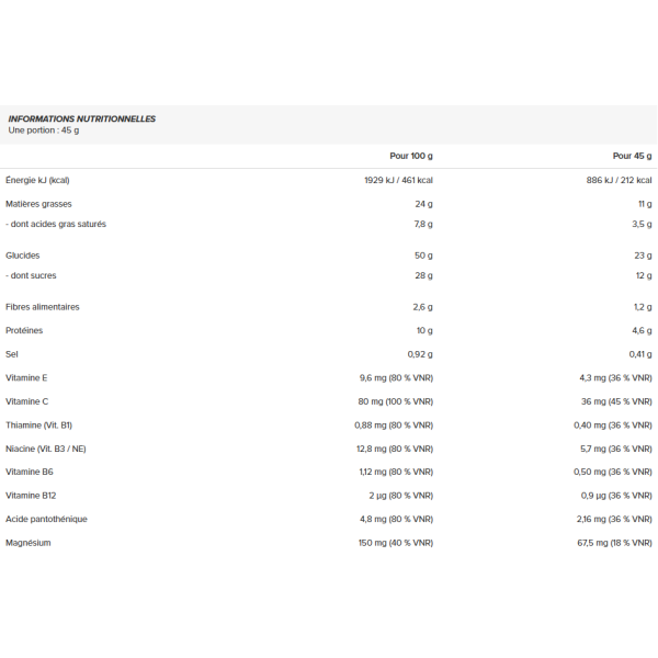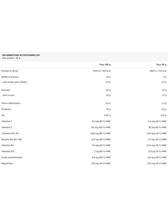 Ingredienti: arachidi 25,5%, cioccolato al latte 25% [zucchero, burro di cacao, latte intero in polvere, pasta di cacao, emulsionante: lecitine (soia); aroma naturale di vaniglia], sciroppo di glucosio, fiocchi di cereali estrusi [farina di riso, farina di frumento, sale, farina di mais, zucchero, malto d'orzo cristallizzato], latte condensato, maltodestrina, sciroppo di zucchero invertito, olio vegetale (girasole), umidificante: glicerolo; emulsionante: lecitine (soia); sale, aroma, acetato di DL-alfa-tocoferile - vit. E, acido L-ascorbico - vit. C, piridossina cloridrato - vit. B6, cloridrato di tiamina - tiamina (vit. B1), nicotinamide - niacina, cianocobalamina - vit. B12, D-pantotenato di calcio - acido pantotenico, ossido di magnesio - magnesio, estratto di guaranà 0,1% [caféine]. Cioccolato al latte - cacao: minimo 35%, solidi del latte: minimo 21%.