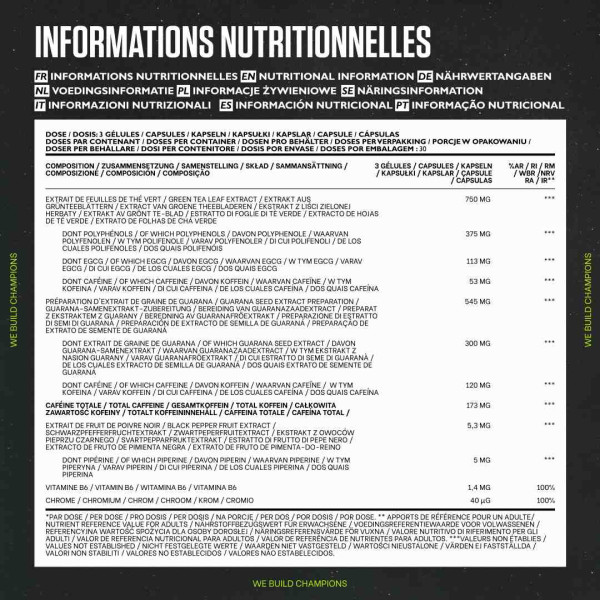 Ingredienti : estratto di foglie di tè verde(Camellia sinensis) 40%, estratto di guaranà [estratto di semi di guaranà(Paullinia cupana), maltodestrina, caffeina] 29%, capsula (idrossipropilmetilcellulosa), agente di carica (gel di cellulosa), agenti antiagglomeranti (sali di magnesio degli acidi grassi, biossido di silicio), estratto di frutti di pepe nero(Piper nigrum) 0,28%, piridossina cloridrato, cromo (III) cloruro.